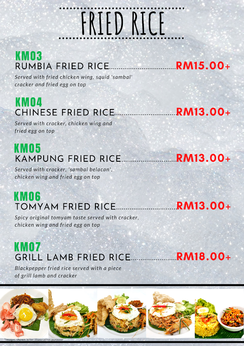 - Fried Rice Delights: Indulge in specialties like the Rumbia Fried Rice with fried chicken wings and sambal crackers, starting at MYR 15.90, or opt for the Kampung Fried Rice for a local twist.